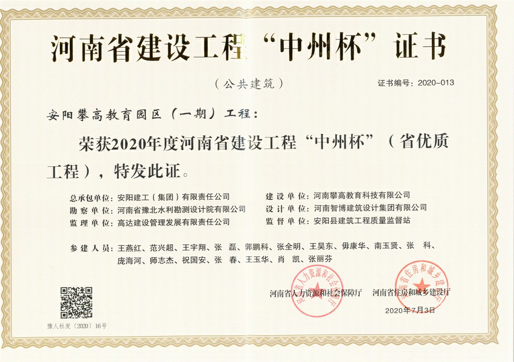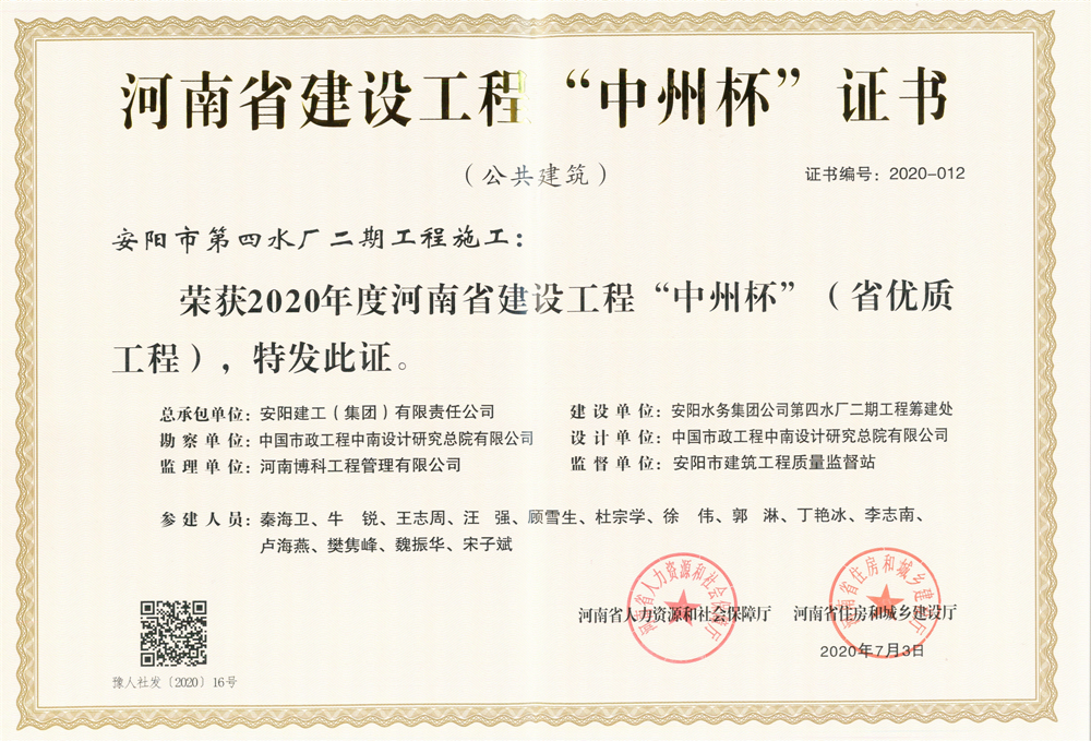 由我公司承建的“安陽(yáng)市第六水廠”、“安陽(yáng)市第四水廠二期”、“安陽(yáng)攀高教育園區(qū)(一期)”工程被評(píng)為2020年度河南省建設(shè)工程“中州杯”獎(jiǎng)。
