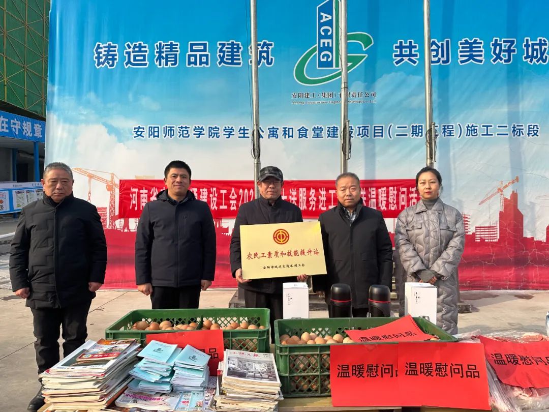 12月27日,河南省農(nóng)業(yè)交通建設(shè)工會(huì)“十送服務(wù)進(jìn)工地”送溫暖慰問活動(dòng)深入到安陽(yáng)建工集團(tuán)師范學(xué)院公寓樓項(xiàng)目部,為大家送來(lái)了溫暖慰問品、安全知識(shí)手冊(cè)、藥品板藍(lán)根、文化書籍等,受到項(xiàng)目部一線職工的歡迎和感謝。安陽(yáng)市總工會(huì)四級(jí)調(diào)研員苗廣軍、安陽(yáng)市城建交通水利工會(huì)主席梁曦等一行領(lǐng)導(dǎo)親手將“溫暖、安全、健康、文化”送到一線員工手中,讓員工非常感動(dòng)。公司工會(huì)主席馬松林同志對(duì)省農(nóng)業(yè)交通建設(shè)工會(huì)、安陽(yáng)市總工會(huì)長(zhǎng)期以來(lái)給予安陽(yáng)建工集團(tuán)的關(guān)心、指導(dǎo)和幫助表示感謝,匯報(bào)了公司項(xiàng)目小家的建設(shè)情況和農(nóng)民工素質(zhì)和技能提升站的運(yùn)行構(gòu)思。