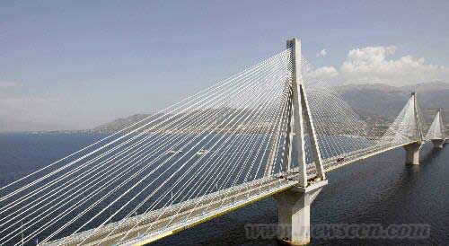 數(shù)千年的地殼運動造成了希臘的伯羅奔尼薩半島和大陸的分離,而今年8月建成的、橫跨科林斯海灣里永-安蒂里永大橋?qū)⒈蛔匀唤绶蛛x了幾千年的這兩塊陸地連接在了一起。它不僅僅是世界上最長的斜拉橋—橋面直接用懸索吊在龍門架上,而且還是世界上技術(shù)最先進的橋梁之一。