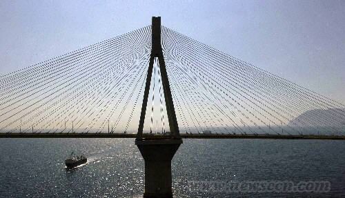 里永·安蒂里永大橋,該大橋全長2883米,連接希臘大陸和伯羅奔尼薩半島。它不僅僅是世界上最長的斜拉橋——橋面直接用懸索吊在龍門架上,而且還是世界上技術(shù)最先進的橋梁之一。