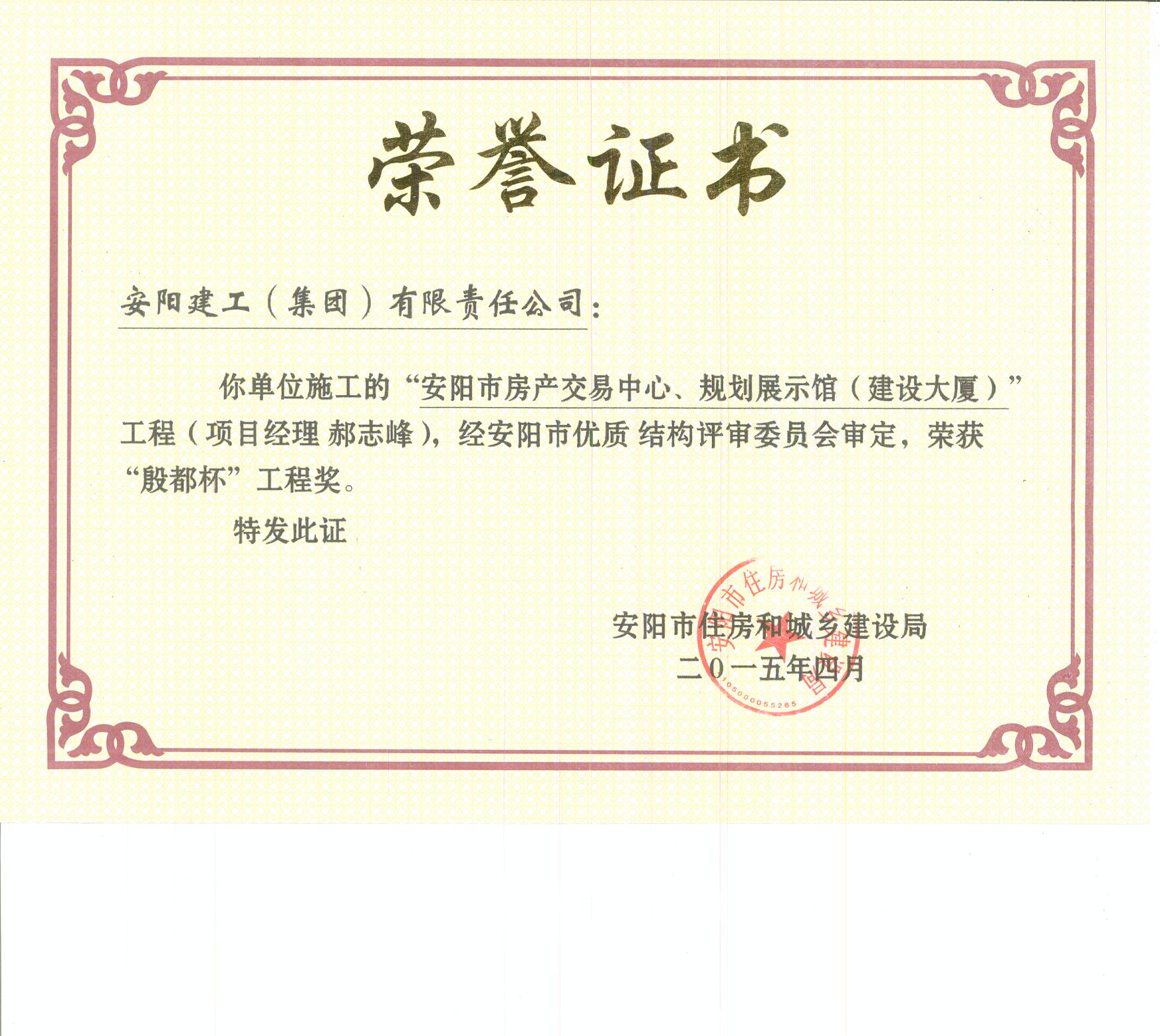 我單位承建的“安陽市房產(chǎn)交易中心、規(guī)劃展示館(建設(shè)大廈)”工程榮獲“殷都杯”工程獎