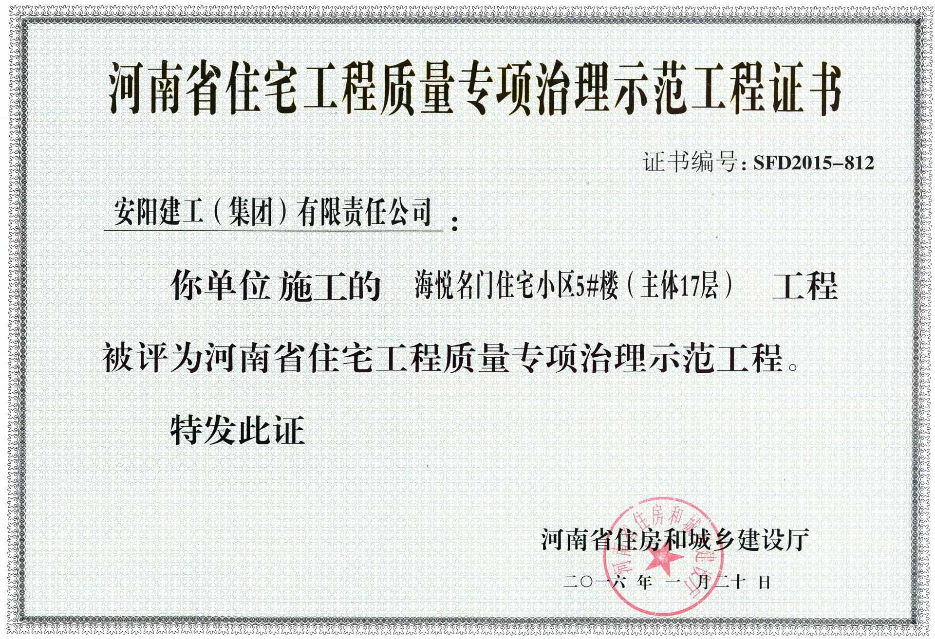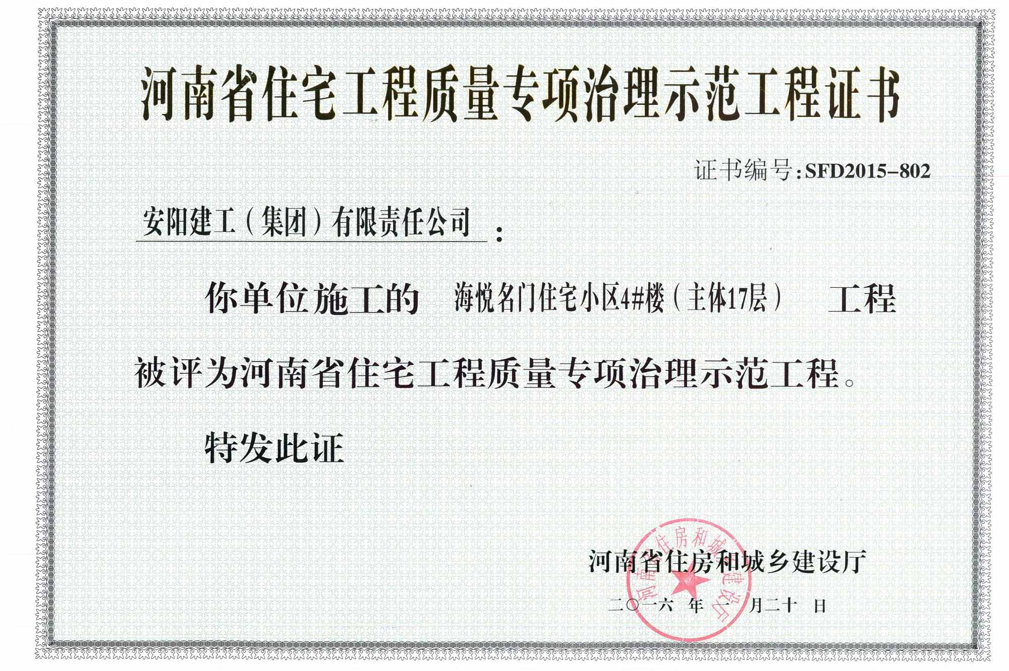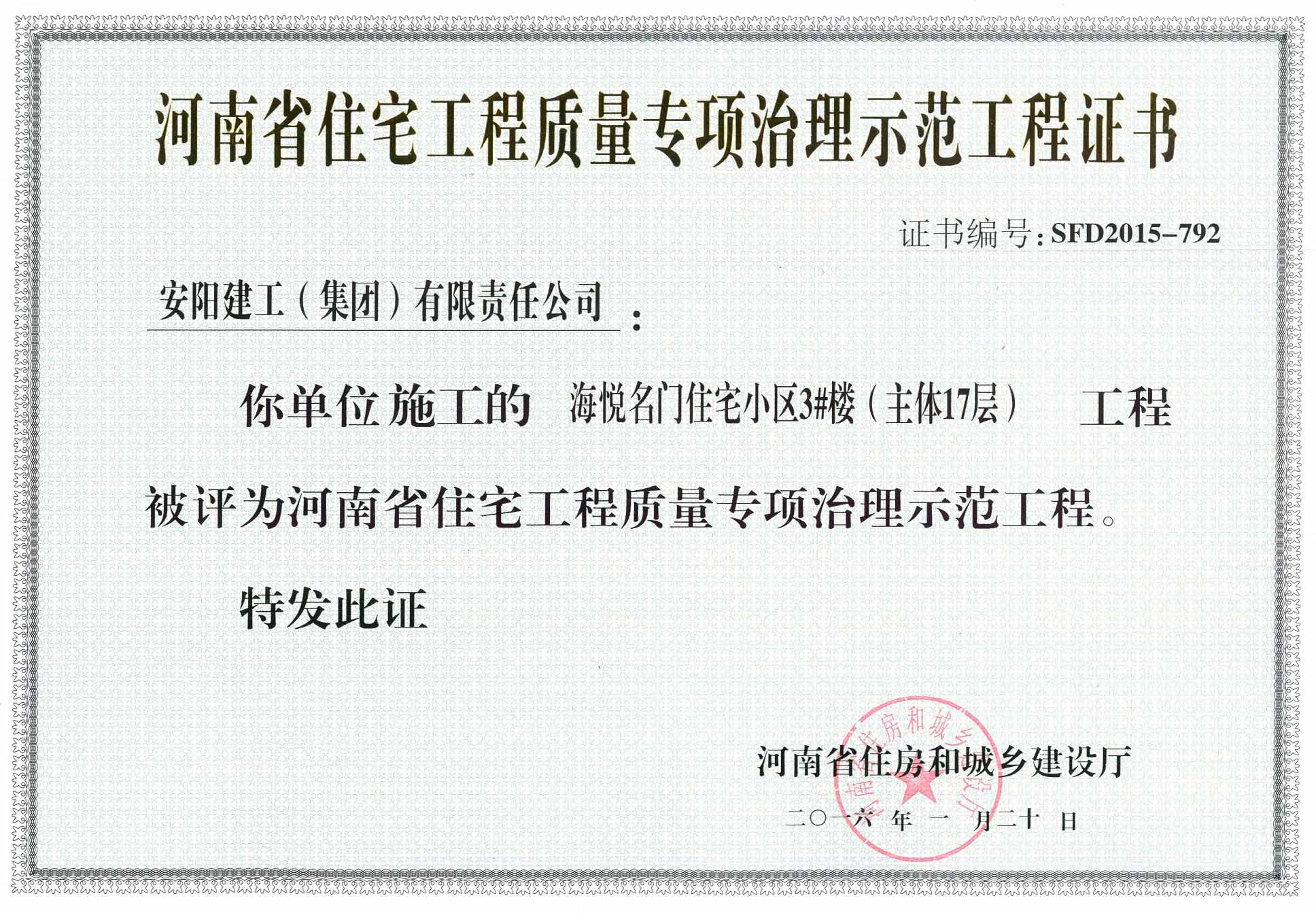 2015年度“河南省住宅工程質(zhì)量專項(xiàng)治理示范工程”獎(jiǎng)花落建工