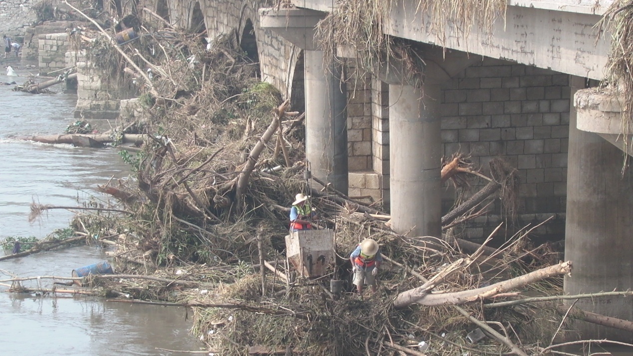 三十多度的高溫,悶熱低壓的天氣,像熱浪似的襲擊著現(xiàn)場(chǎng)的建工人,在吊車?yán)锏睦顟驯6啻我驗(yàn)楦邷靥鞖舛惺顕I吐,人雖年輕責(zé)任感卻很大的吊車司機(jī)王宇超,在開始的幾天,為了追趕進(jìn)度,整日沒有輪休的堅(jiān)守在吊車內(nèi)。橋上司機(jī)頭頂高溫酷熱,河道內(nèi)的工人們也不輕松。由于機(jī)械有時(shí)不能很好的抓住河道內(nèi)的障礙物,需要現(xiàn)將工人用吊繩送至河道,然后人工進(jìn)行捆綁方能將樹干吊出水面。我們的工人一下水就是幾小時(shí)的在水里泡著,污濁的河水有時(shí)都能淹到他們腰部,腳下是泥濘的污泥,周圍、有被河水腐蝕的樹干在高溫的發(fā)酵下散發(fā)著難以忍受的惡臭,面對(duì)惡劣的環(huán)境,建工人沒有抱怨,有的只是不畏艱辛的埋頭苦干,每個(gè)人心里都有一個(gè)共同的信念:我們今日辛苦點(diǎn),明日險(xiǎn)情早排除,汛情如果再來臨,安陽人民定平安,一切的付出都是值得的!