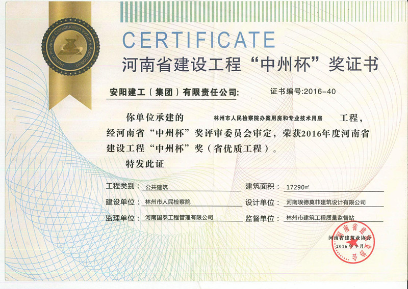 我單位承建的 林州市人民檢察院辦案用房和專業(yè)技術(shù)用房工程榮獲2016年河南省建設(shè)工程“中州杯獎(jiǎng)”