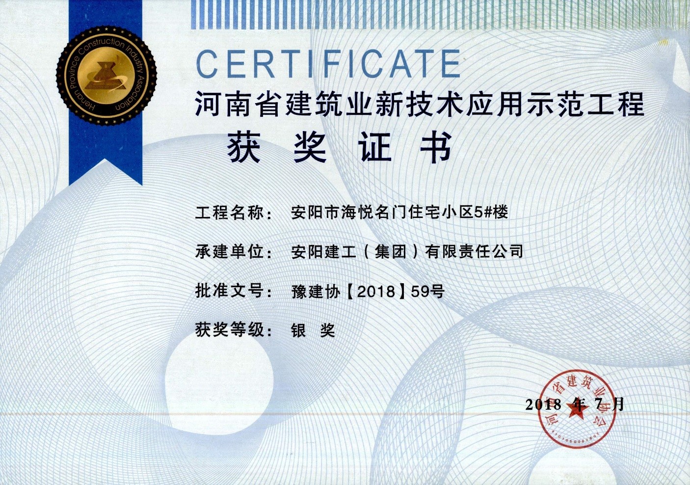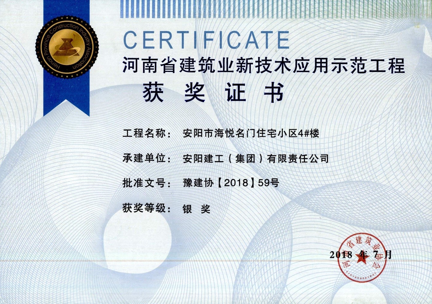 我公司安陽市海悅名門4#5#項目榮獲18年省建筑業(yè)新技術應用示范工程