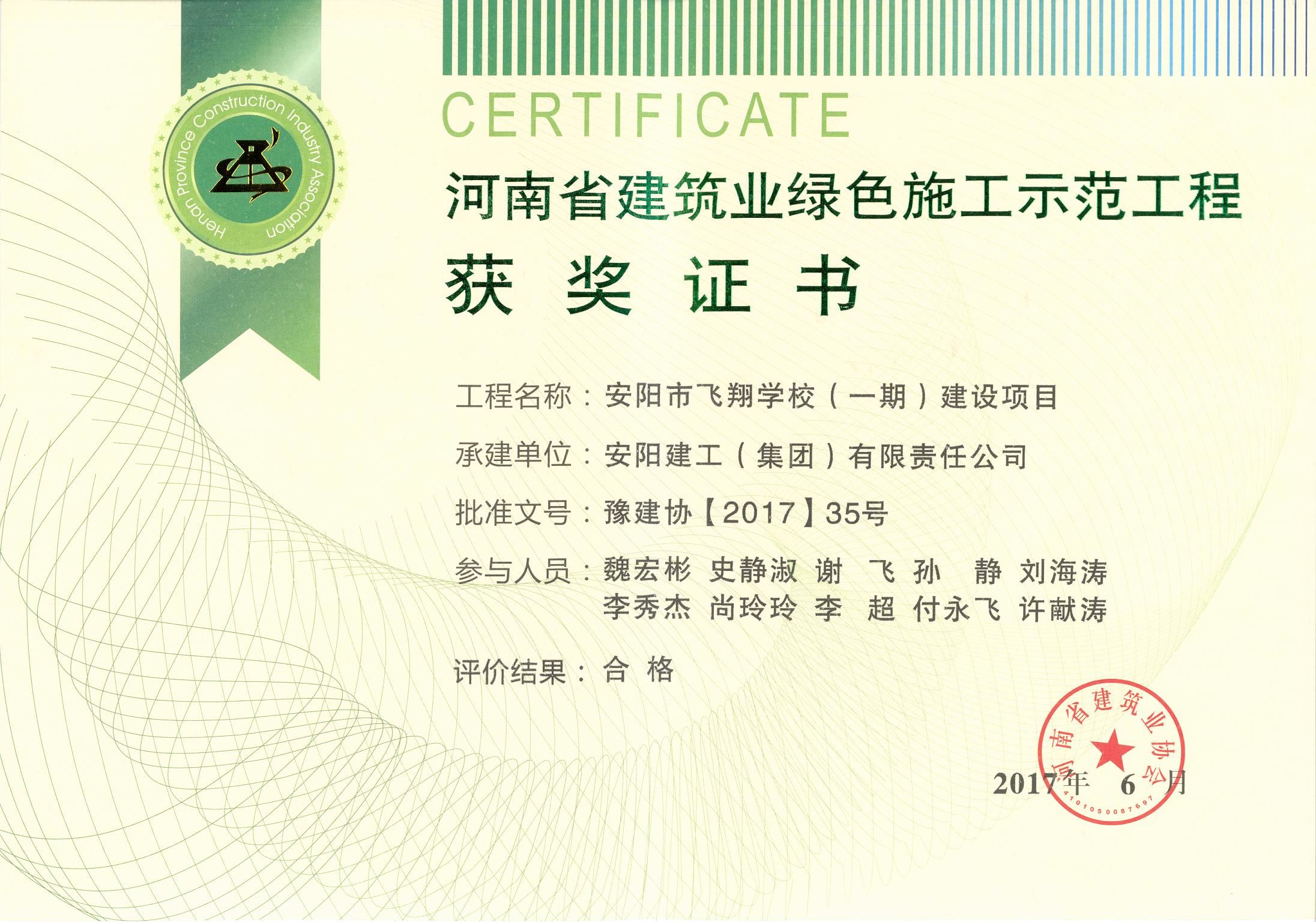 我公司安陽市飛翔學校一期項目榮獲17年省建筑業(yè)綠色施工示范工程