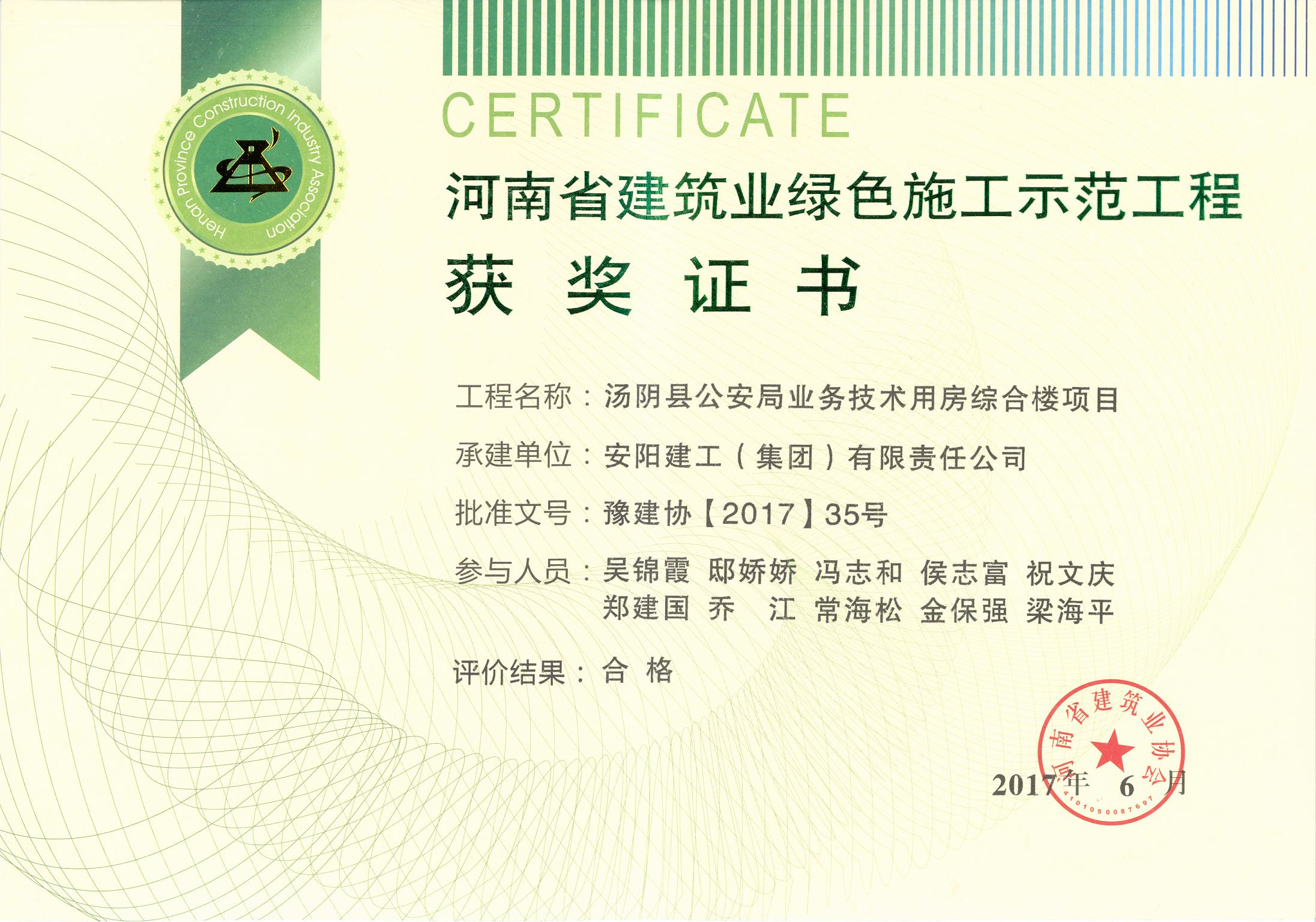 我公司湯陰縣公安局綜合樓項目榮獲17年省建筑業(yè)綠色施工示范工程