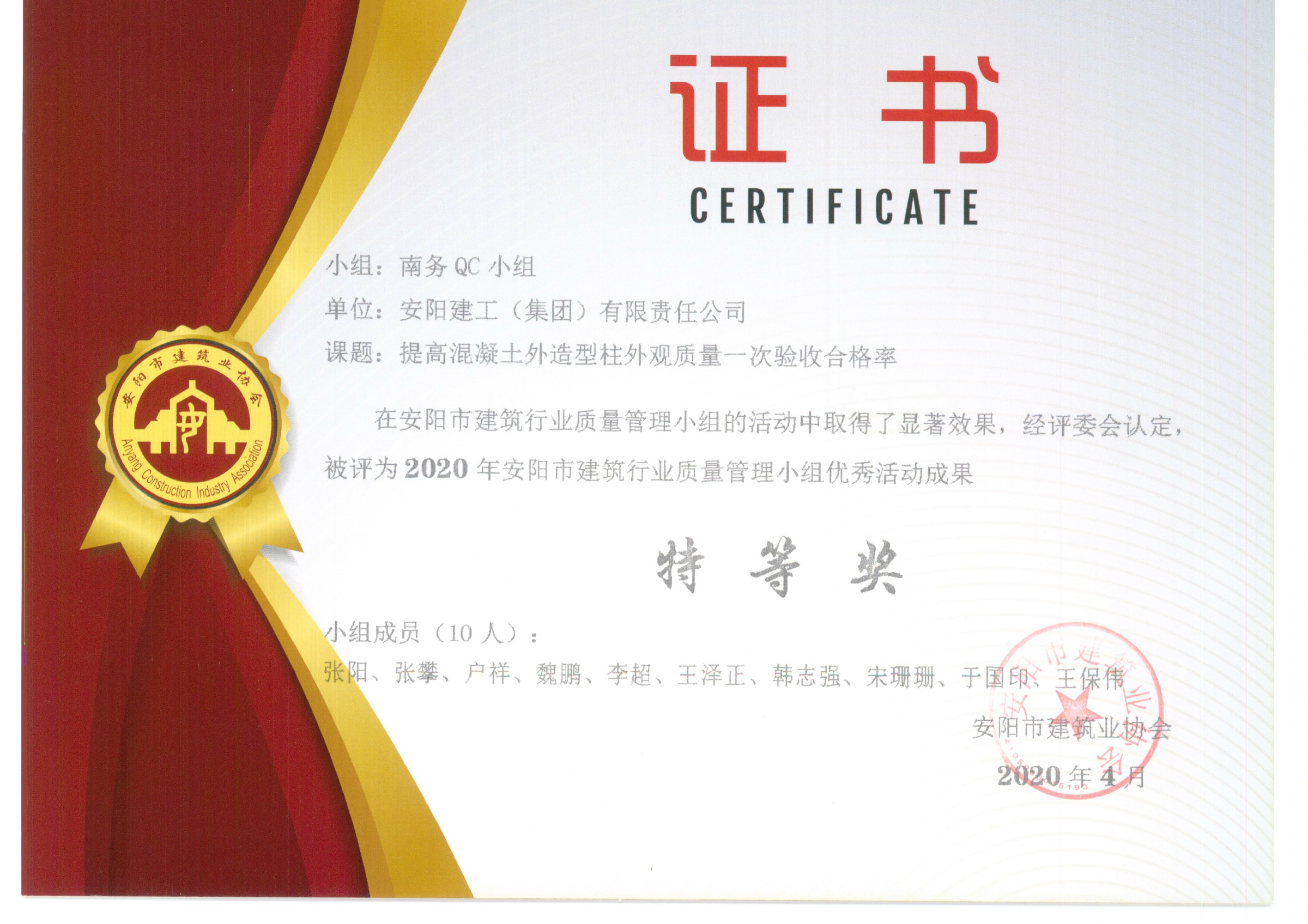 我公司南務(wù)QC小組榮獲2020年安陽市建筑行業(yè)QC小組成果特等獎