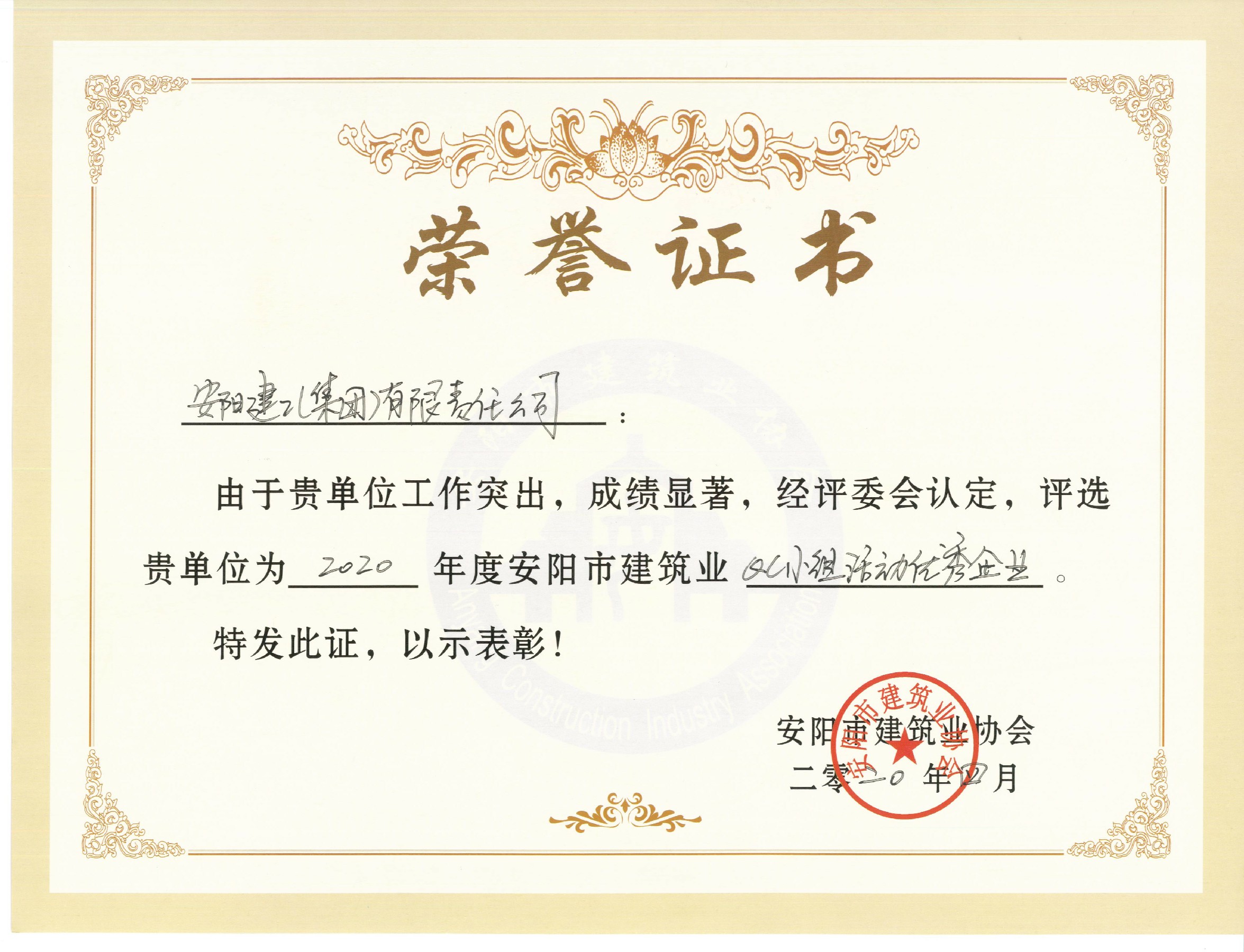我公司榮獲2020年安陽(yáng)市建筑業(yè)QC小組活動(dòng)優(yōu)秀企業(yè)