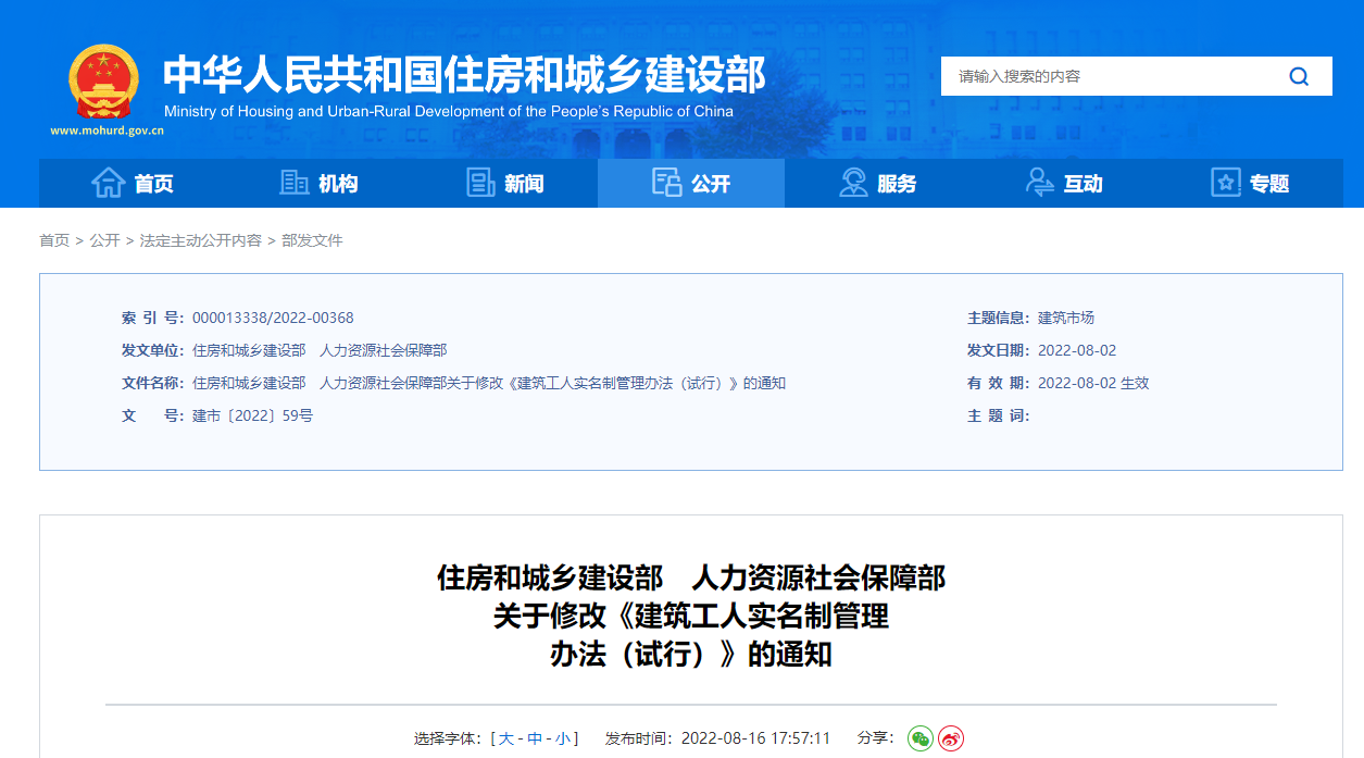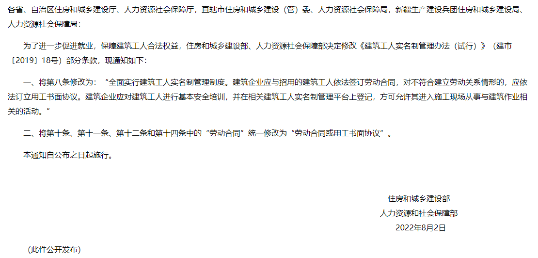 住房和城鄉(xiāng)建設(shè)部 人力資源社會保障部 關(guān)于修改《建筑工人實(shí)名制管理 辦法(試行)》的通知