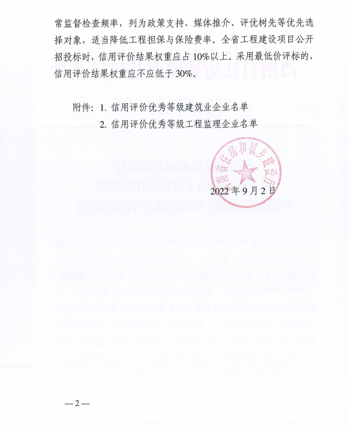 9月2日,河南省住房和城鄉(xiāng)建設(shè)廳發(fā)布《關(guān)于首次公布全省信用評(píng)價(jià)優(yōu)秀等級(jí)建筑業(yè)和工程監(jiān)理企業(yè)名單的公告》,我公司喜獲“信用評(píng)價(jià)優(yōu)秀等級(jí)建筑業(yè)企業(yè)”榮譽(yù)。加強(qiáng)建筑市場信用體系建設(shè)是我國“十四五建筑業(yè)發(fā)展規(guī)劃”中明確的一項(xiàng)主要任務(wù)。為加快推進(jìn)全省建筑市場信用體系建設(shè),河南省住房和城鄉(xiāng)建設(shè)廳于2021年7月印發(fā)了《河南省建筑市場主體信用評(píng)價(jià)辦法(暫行)》(豫建行規(guī)[2021]2號(hào)),對于入選本次信用評(píng)價(jià)優(yōu)秀等級(jí)的企業(yè),將實(shí)行守信激勵(lì),降低承建項(xiàng)目日常監(jiān)督檢查頻率,列為政策支持、媒體推介、評(píng)優(yōu)樹先等優(yōu)先選擇對象,且適當(dāng)降低工程擔(dān)保與保險(xiǎn)費(fèi)率。在全省工程建設(shè)項(xiàng)目公開招投標(biāo)時(shí),信用評(píng)價(jià)結(jié)果權(quán)重應(yīng)占10%以上。采用最低價(jià)評(píng)標(biāo)的,信用評(píng)價(jià)結(jié)果權(quán)重應(yīng)不低于30%。