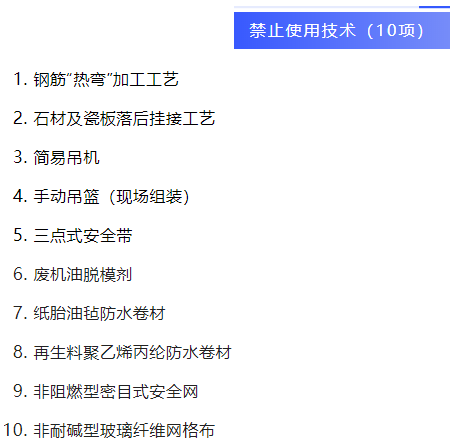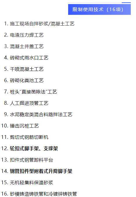 近日,住建部官網(wǎng)發(fā)布《關(guān)于《房屋市政工程禁止和限制使用技術(shù)目錄(2022年版)(征求意見稿)》公開征求意見的通知》,簡易吊機、鋼筋“熱彎”加工工藝、三點式安全帶等10項技術(shù)擬被禁止使用。輪扣式腳手架、支撐架、扣件式鋼管卸料平臺、鋼管扣件型附著式升降腳手架等16項技術(shù)擬被限制使用。