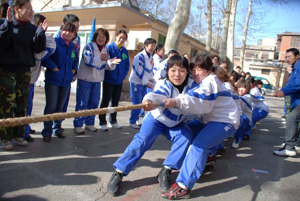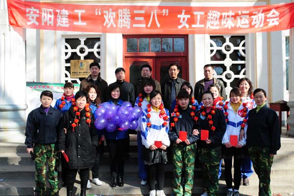 運動會共設(shè)有個人項目和團(tuán)體比賽項目,每個項目分兩輪進(jìn)行比賽,第一個進(jìn)行的“快樂呼啦圈”是個人參賽項目,分別由紅隊的紀(jì)敏和藍(lán)隊的徐萌獲勝;“鳳凰歸巢”是團(tuán)體項目,要求一名隊員手持筐,另一名隊員在指定位置把毽子投入筐中,你可別小看這空中飛毽,沒有一定的準(zhǔn)頭還真扔不進(jìn)去;接下來的“手足情深、蜈蚣競走”、“接力賽”和“心心相印”也都是團(tuán)體項目,需要隊員相互的配合才能完成,比賽過程緊張激烈,妙趣橫生,各隊選手是奮進(jìn)齊驅(qū),一爭上下;最后進(jìn)行的拔河比賽更是扣動人心,要求各隊的隊長必須要參加,先抽簽進(jìn)行第一輪4進(jìn)2,再2進(jìn)1,三局兩勝定勝負(fù),各隊派10名隊員參加,隨著裁判的一聲哨響,長繩兩旁的隊員們開始奮力的拉繩,啦啦隊員的加油聲更是激奮了動力和斗志,最后,紅隊一舉獲勝,不僅贏取了這個比賽項目的獲勝獎,也是所有比賽項目中獲勝最多的一隊。頒獎儀式由工會主席馬松林主持,公司領(lǐng)導(dǎo)親自為獲獎選手頒獎并合影留念,三八趣味運動會在美妙的音樂和歡慶的舞蹈中圓滿的畫上了尾聲。
