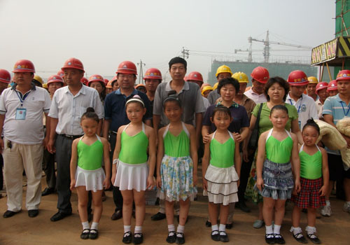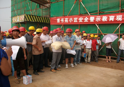 7月15日上午,安陽市總工會副主席宋忠平、保障部部長呂啟霞、城建水利工會副主席董江紅一行,來到我公司承建的如火如荼的博書苑工地,看望在高溫時節(jié)奮戰(zhàn)在施工一線的建筑工人,并為他們送去了毛巾、風油精、汗衫、《農民工知識讀本》等防暑降溫慰問品,市總工會給工地帶來了關懷帶來了愛,同時也為工地帶來了歡快活潑的少兒舞蹈“愛的人間”,小朋友們用稚嫩的聲音深情地說:工人叔叔辛苦了!她們的熱情感染了在場的每個人。宋主席一邊給工人送上慰問品,一邊關切地詢問他們的工作、生活情況,囑咐要注意身體健康、防暑降溫。他說:“博書苑是安陽市最大的經(jīng)濟適用房,一直受到市各級領導的關注,你們冒著酷暑仍然堅守在工作崗位上,辛苦了,我向你們表示感謝?!彼诠さ匾侠戆才殴て谟媱潱欢ㄒ尮と俗⒁夂侠硇菹?。公司副總經(jīng)理郝志峰、工會主席馬松林到現(xiàn)場參加了活動,郝經(jīng)理表示:我們要更加努力的工作,克服高溫酷暑,全力投入生產,以實際行動感謝市工會的關心支持!面對還將持續(xù)下去的高溫天氣,我們要繼續(xù)發(fā)揚艱苦奮斗、無私奉獻的精神,堅守工作崗位,安全生產,安全度夏。