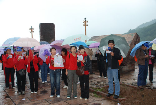 天空雖然飄著細雨,但大家熱情高漲.由聶磊、肖丹、黨飛主持的紅歌會上,大家用歌聲向新中國60歲生日獻上了一份厚禮, 《咱建工的人》唱出了建工人的氣勢和豪情;拉歌賽表達了建工人的一份愛國之情,馬主席作了熱情洋溢地動員講話,他說“這是公司工會組織的人數(shù)最多,規(guī)模最大的一次旅游,意義重大,這不僅是一次娛樂活動,更是集團公司精神風貌的展示活動。今天讓我們放飛心情,和大自然親密接觸,最后祝愿大家四句話:開心出發(fā),安全第一;放松游山,凱旋而歸!”