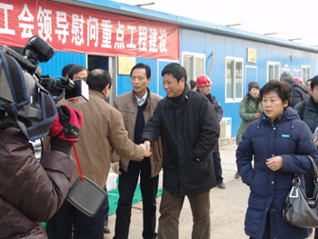 元月10日(周日)上午,省總工會及市總工會領(lǐng)導(dǎo)冒著嚴(yán)寒,帶著精美的羽絨服、精制的大米、白面和美味的豬肉及《農(nóng)民工知識讀本》來到我們公司施工的安陽市電子信息學(xué)校工地,向建設(shè)一線職工和在這里務(wù)工的農(nóng)民工送去了溫暖,送去了工會組織對農(nóng)民工的深切關(guān)懷。